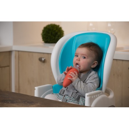 Gourde bébé souple à remplir vendue avec 2 embouts : une tétine 1er âge silicone (6 – 12 mois) et un embout 2e âge rigide (12 mois+).