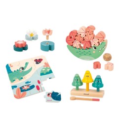 Grande panthère d'activités, accompagnée par son tout-petit, le caméléon et le papillon. Elle comporte un prisme, une spatule dentaire, un miroir, un cordon avec des perles et des petits gris-gris… Son corps est doux et moelleux et peut servir de coussin.
