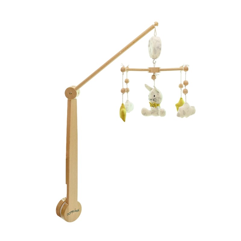 Rupture de stockLe mobile musical Leafy Bunny est l'allié idéal pour accompagner tendrement bébé vers le sommeil. Sa boîte à musique enveloppée habillée de son fourreau en tissu, est agrémentée d'un bouton marche/arrêt qui permet de déclencher ou stopper la douce mélodie. Son arche en bois en hêtre massif non traité, est orientable facilement. Placer au dessus de bébé, étoiles, nuages et lapin sauront les plonger dans une ambiance douce pour favoriser l'endormissement. Il se fixe facilement aux barreaux du lit grâce à sa molette, équipé d'un patin en feutrine, afin de ne pas endommager le lit. Conforme aux normes de sécurité en vigueur, il est conseillé de retirer le mobile dès lors que l'enfant s'assoit dans son lit. Découvrez la collection Leafy Bunny de la marque DOMIVA aux