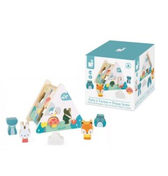 Une jolie boîte à formes dans des tons tout doux et très actuels avec des animaux tout mignons. Les 6 formes à encastrer dans le tipi aideront les tout-petits à développer leur dextérité tout en s’amusant. Bois : Boîte en contreplaqué, pièces en merisier. Peinture à l'eau. Boîte fermée.